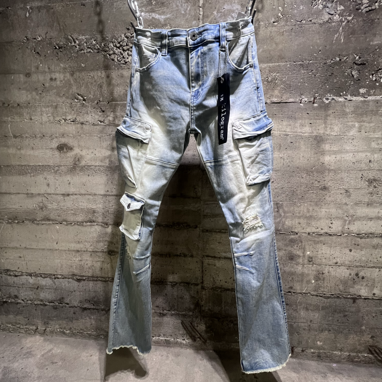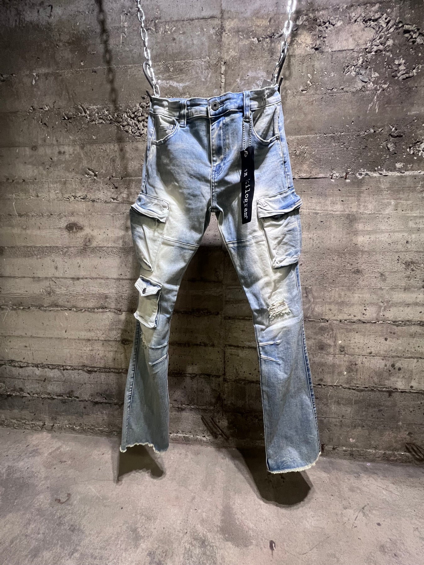 Upgrade your denim game with our KG14066 Kilogram Cargo Denim Jeans. The stacked flare fit boasts both style and comfort, while the cargo pockets add a touch of functionality. Perfect for any casual occasion, these jeans will take your look to the next level.
